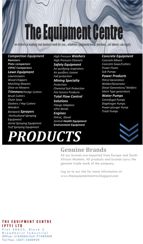 The Equipment Centre has been in business for over 25 years and has a good track record or good service and genuine Parts and Equipment delivery. Our biggest clients include The President’s Office, Botswana Defense Force, Water Utilities, Government Printers, Builders Warehouse, EEZE Build, Jamal Trading …..